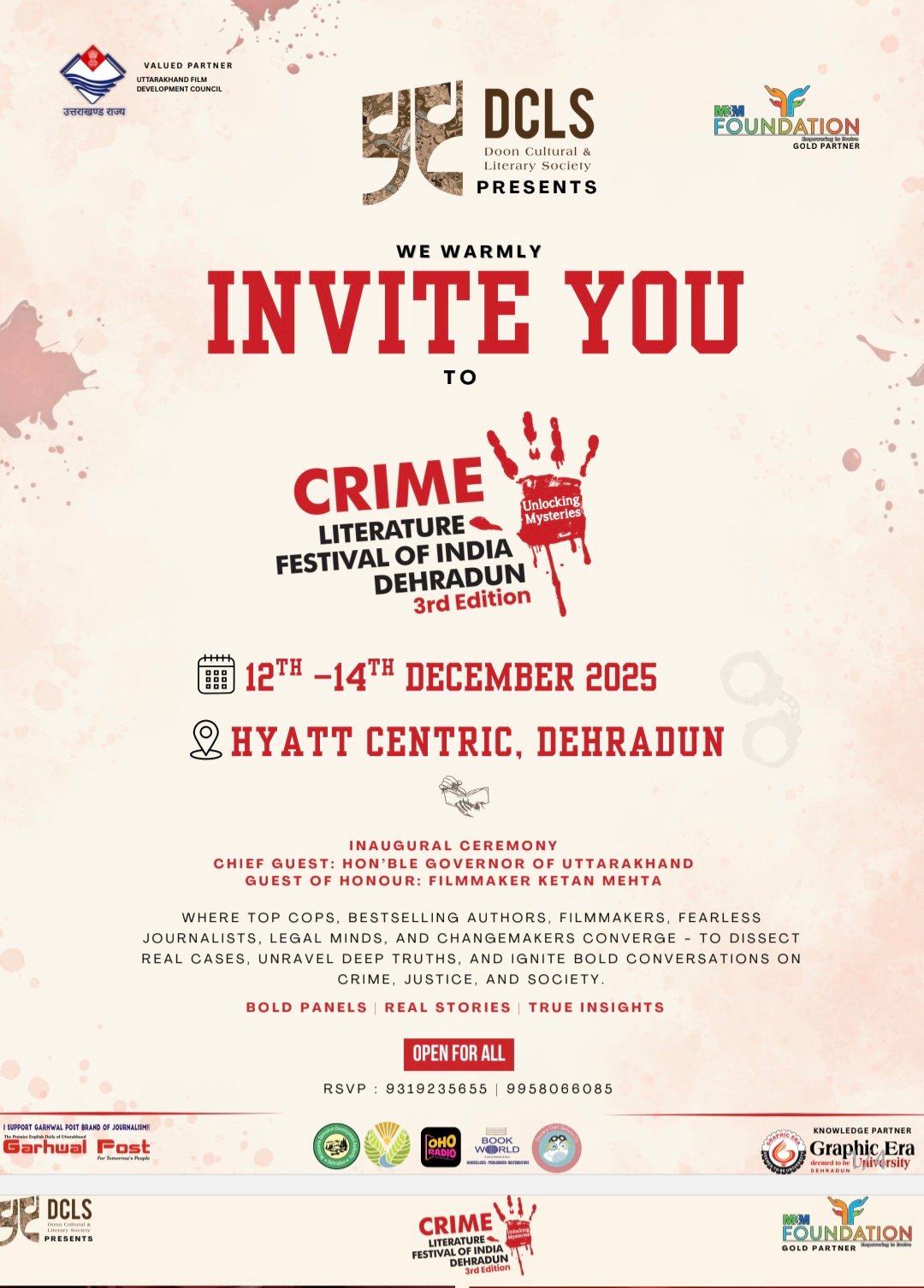 उत्तराखंड के राज्यपाल ले. जनरल (सेनि.) गुरमीत सिंह करेंगे उद्घाटन, पहले दिन मुख्य अतिथि होंगे फिल्म निर्देशक केतन मेहता देहरादून : दून कल्चरल एंड लिटरेरी सोसाइटी (डीसीएलएस) द्वारा आयोजित क्राइम लिटरेचर फेस्टिवल अपनी प्रतीक्षित तीसरी संस्करण के साथ 12 से 14 दिसंबर तक होटल हयात सेंट्रिक, देहरादून में आयोजित किया जा रहा है। 12 दिसंबर को होने वाले उद्घाटन समारोह में उत्तराखंड के राज्यपाल लेफ्टिनेंट जनरल गुरमीत सिंह (सेवानिवृत्त) मुख्य अतिथि होंगे, जबकि प्रसिद्ध फिल्म निर्देशक केतन मेहता सम्मानित अतिथि के रूप में उपस्थित रहेंगे।