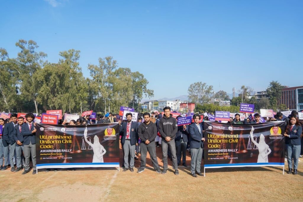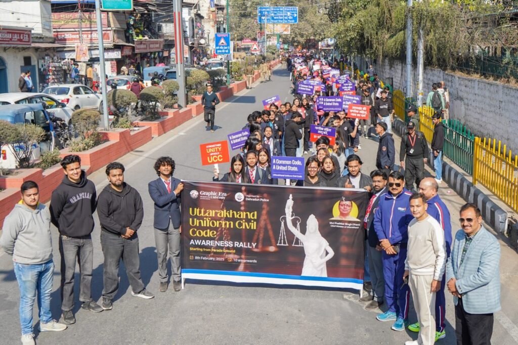 देहरादून,08फरवरी2025।दून पुलिस के सहयोग से यूनिफॉर्म सिविल कोड (यूसीसी) के प्रति जागरूकता फैलाने के उद्देश्य से आज देहरादून में एक विशाल जागरूकता रैली का आयोजन किया गया। ग्राफिक एरा और डीआईटी विश्वविद्यालय के लगभग 2,000 छात्र-छात्राओं ने इस रैली में बढ़-चढ़कर भाग लिया। रैली परेड ग्राउंड से शुरू होकर दर्शनलाल चौक, घंटाघर होते हुए रिजर्व ग्राउंड में समाप्त हुई।