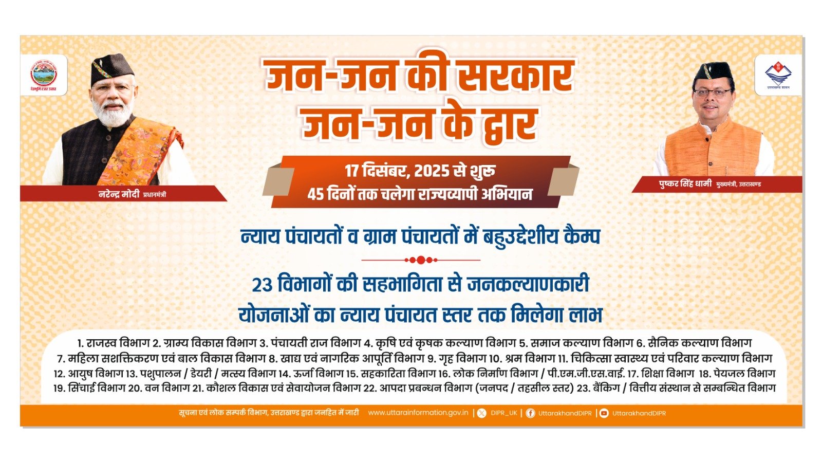 उत्तरकाशी। उत्तराखण्ड शासन द्वारा “जन-जन की सरकार, जन-जन के द्वार” अभियान के अन्तर्गत जिले की न्याय पंचायतों में कैम्प लगाए जाने तथा न्याय पंचायतों/ग्राम पंचायतों में जन-सामान्य को केन्द्र सरकार तथा राज्य सरकार की विभिन्न योजनाओं का लाभ प्रदान किए जाने एवं अन्य आवश्यक कार्यवाही किए जाने के सम्बंध में दिशानिर्देशों दिये गए हैं।