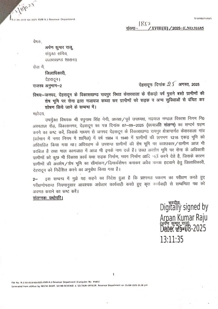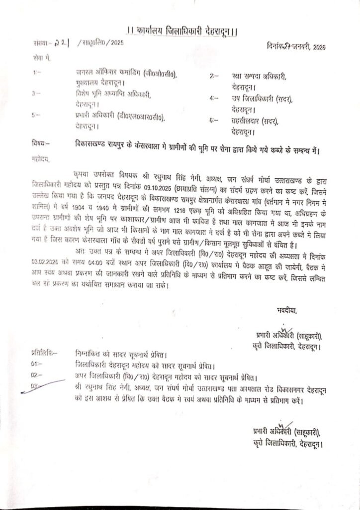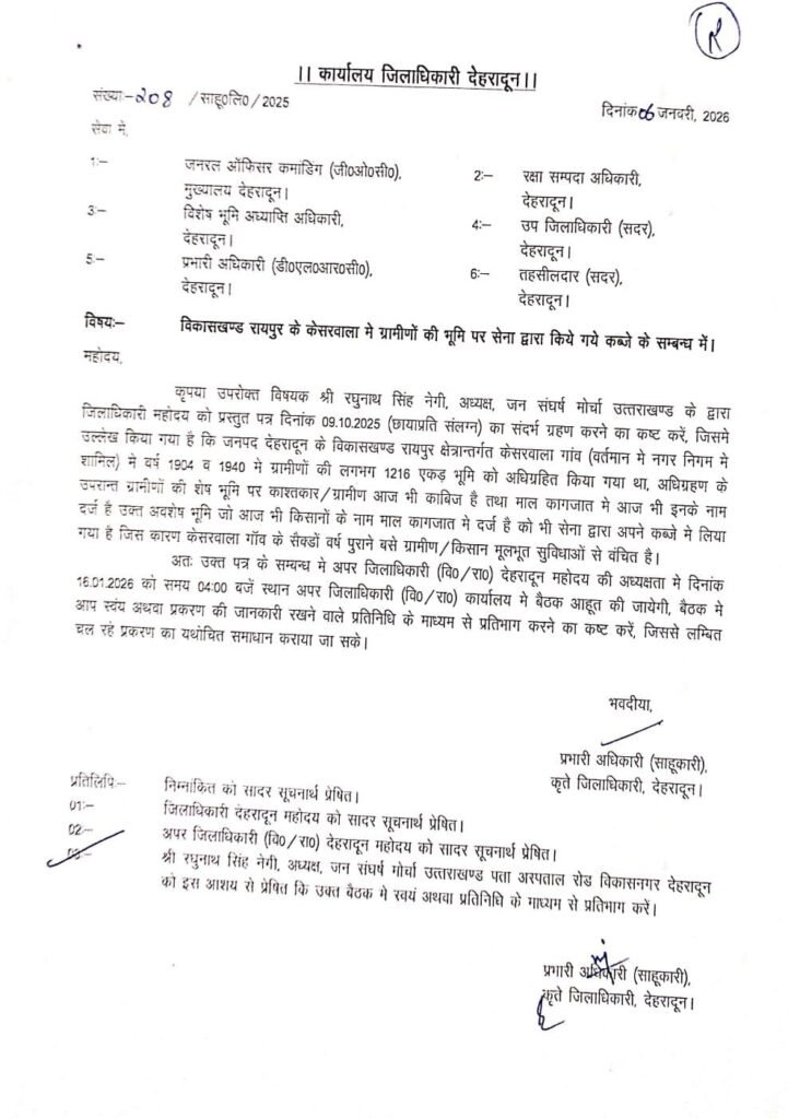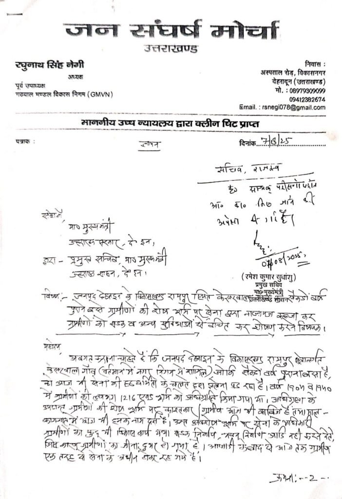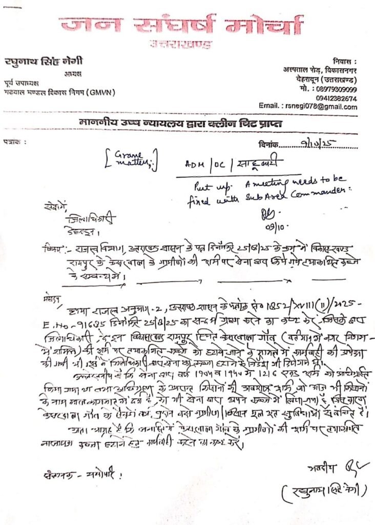 जन संघर्ष मोर्चा के जिला मीडिया प्रभारी प्रवीण शर्मा पिन्नी ने आरोप लगाया कि मोर्चा अध्यक्ष रघुनाथ सिंह नेगी शासन स्तर से लेकर जिला प्रशासन तक इस मामले को लेकर लगातार प्रयासरत हैं। उनके प्रयासों का ही नतीजा है कि प्रमुख सचिव मुख्यमंत्री सुधांशु ने 7 अगस्त 2025 को सचिव राजस्व को कार्रवाई के निर्देश दिए। इसके बाद 25 अगस्त को राजस्व विभाग ने जिलाधिकारी को पत्र लिखकर मामले का निस्तारण करने को कहा। नेगी के आग्रह और शासन के निर्देश पर जिलाधिकारी ने 9 अक्टूबर को इस मामले को गंभीरता से लेते हुए एडीएम समेत अन्य अधिकारियों को संयुक्त बैठक बुलाकर प्रकरण सुलझाने के आदेश जारी किए।