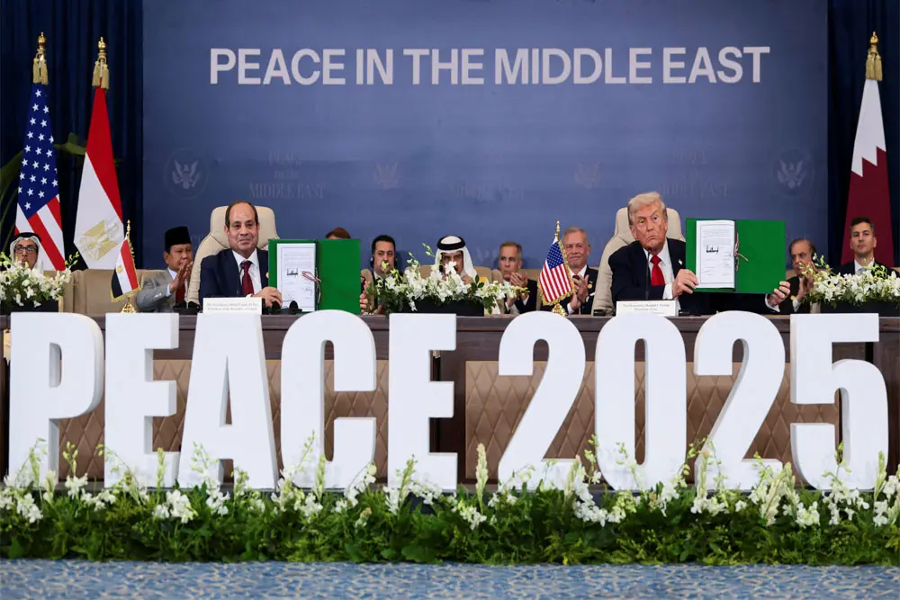 वही पुराना रिसॉर्ट, जहाँ कूटनीति अक्सर नाटक जैसी लगती है। पीछे चमकता नारा—“Peace in the Middle East”—एक चुनावी पोस्टर की तरह। हाथ मिलाना, हस्ताक्षर करना, फोटो खिंचवाना—सब था, सिवाय ईमानदारी के। ट्रंप ने भाषण दिया—स्वयं की प्रशंसा से भरा, नीति से खाली। यह शांति का प्रदर्शन था, ऊपरी चमक में सुंदर, गहराई में शून्य। पाकिस्तान के प्रधानमंत्री शहबाज़ शरीफ़ ने भी अपनी भूमिका निभाई—ट्रंप को “शांति का व्यक्ति” बताया, “दूरदर्शी नेतृत्व” का गुणगान किया, यहाँ तक कि पाकिस्तान द्वारा उन्हें नोबेल के लिए नामित करने का दावा किया। यह प्रशंसा नहीं, प्रहसन था, कूटनीति तालियों में सिमट गई थी। और जब कन्फ़ेटी हवा में उड़ी और शैंपेन की खनक गूँजी, तो पीछे बस तमाशा बचा—न कोई रोडमैप, न स्पष्टता, न वह व्यावहारिकता जो भाषण को ज़मीन पर उतारती है।
