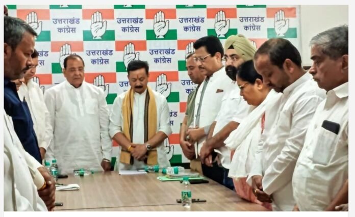 देहरादून। उत्तराखंड प्रदेश कांग्रेस ने जम्मू कश्मीर में पहलगाम में कल दोपहर आतंकवादियों द्वारा किए गए पर्यटकों पर हमले को नृशंस नरसंहार बताते हुए घटना की कठोर भर्त्सना करते हुए केंद्र सरकार से आतंकवादियों व आतंकवाद पर कठोरतम कार्यवाही की मांग करते हुए आज प्रदेश कांग्रेस मुख्यालय में प्रदेश अध्यक्ष करण माहरा की अध्यक्षता में एक शोक सभा का आयोजन किया जिसमें प्रदेश कांग्रेस के सह प्रभारी सुरेन्द्र शर्मा,नेता प्रतिपक्ष यशपाल शर्मा, पूर्व अध्यक्ष व विधायक प्रीतम सिंह, प्रदेश उपाध्यक्ष संगठन व प्रशासन सूर्यकांत धस्माना, विधायक फुरकान अहमद, विधायक अनुपमा रावत, विधायक वीरेंद्र जाती, महानगर अध्यक्ष डॉक्टर जसविंदर सिंह गोगी, जिला अध्यक्ष मोहित उनियाल, जयेंद्र रमोला, राजवीर सिंह, राकेश सिंह मियां, गौरव चौधरी, बॉबी नौटियाल, वीरेंद्र पोखरियाल, अमन गर्ग, शीश पाल सिंह बिष्ट समेत अनेक महत्वपूर्ण नेता शामिल हुए।