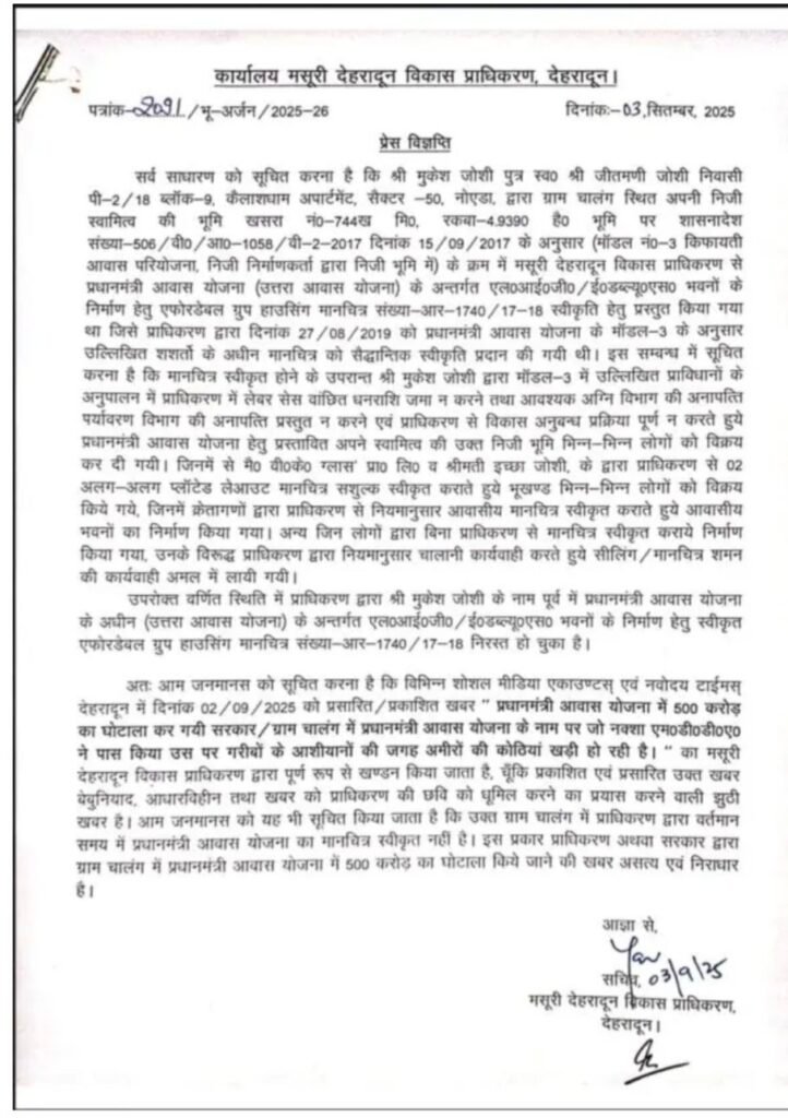 देहरादून। मसूरी-देहरादून विकास प्राधिकरण (एमडीडीए) ने प्रधानमंत्री आवास योजना के नाम पर ग्राम चालंग में 500 करोड़ के घोटाले की खबरों को भ्रामक और असत्य बताया है। प्राधिकरण ने साफ कहा है कि यह योजना मान्यता प्राप्त नहीं है और न ही इस नाम पर कोई वित्तीय अनियमितता हुई है।
