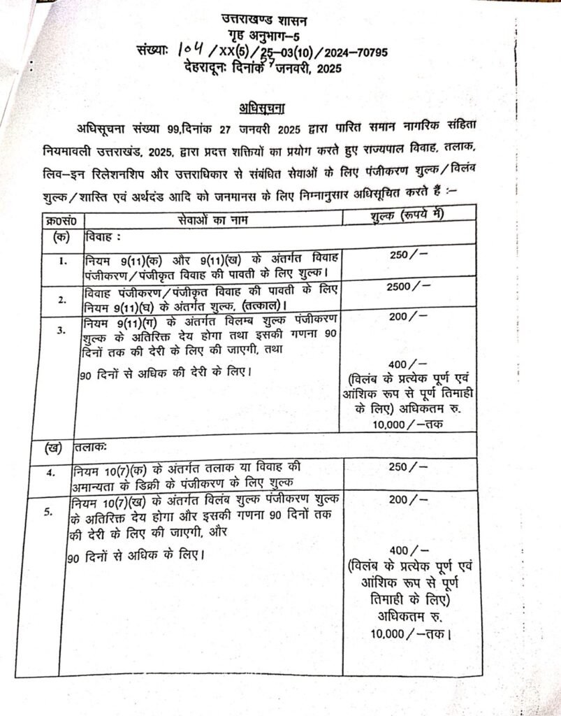 देहरादून दिनांक 20 फरवरी 2025 (सू.वि), मुख्य विकास अधिकारी अभिनव शाह ने अवगत कराया है कि समान नागरिक संहिता नियमावली, 2025 में विवाह, तलाक, लिव-इन रिलेशनशिप और उत्तराधिकार से सम्बन्धित सेवाओं के लिए पंजीकरण शुल्क, विलंब शुल्क/शास्ति एवं अर्थदण्ड का प्रावधान किया गया है।