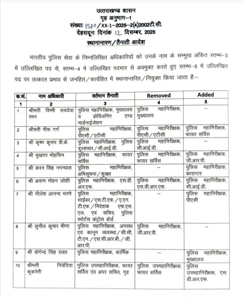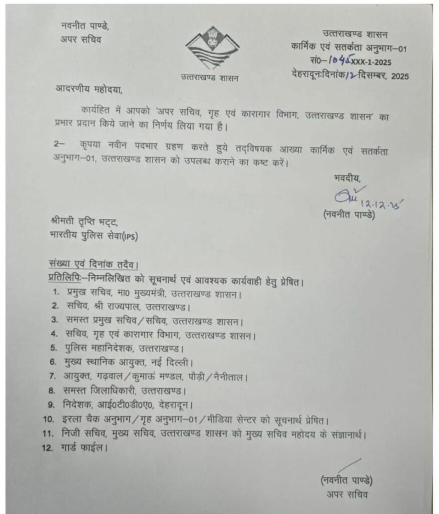 देहरादून : उत्तराखंड सरकार ने गुरुवार को राज्य के पुलिस प्रशासन में बड़ा फेरबदल किया। प्रदेश सरकार ने 15 भारतीय पुलिस सेवा (आईपीएस) अधिकारियों के स्थानांतरण एवं नई नियुक्तियों के आदेश जारी किए। इनमें एक प्रमुख निर्णय आईपीएस अधिकारी तृप्ति भट्ट को गृह विभाग में अपर सचिव का महत्वपूर्ण दायित्व सौंपना है।