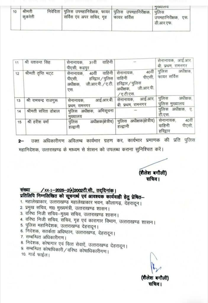 योगेंद्र सिंह रावत को पुलिस महानिरीक्षक (मुख्यालय) नियुक्त किया गया है। निवेदिता कुकरेती को अब पुलिस उपमहानिरीक्षक (एसडीआरएफ) बनाया गया है। यशवंत सिंह को आईआरबी प्रथम रामनगर का सेनानायक नियुक्त किया गया है।