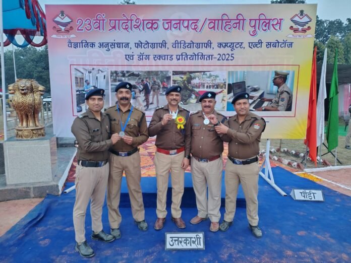 हरिद्वार/उत्तरकाशी। 40वीं वाहिनी पीएसी हरिद्वार में 11 से 13 दिसंबर 2025 तक आयोजित 23वीं प्रादेशिक जनपद/वाहिनी पुलिस वैज्ञानिक अनुसन्धान, फोटोग्राफी, वीडियोग्राफी, एंटी सबोटॉज एंड डॉग स्क्वाड प्रतियोगिता में उत्तरकाशी पुलिस के अधिकारियों और कर्मियों ने शानदार प्रदर्शन करते हुए तीन पदक अपने नाम किए।