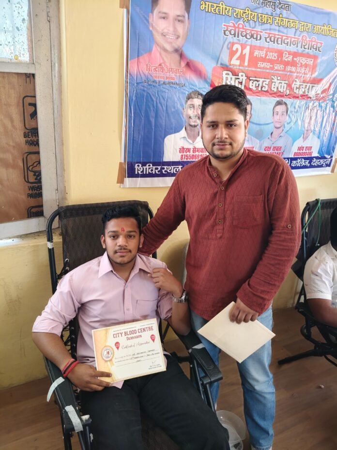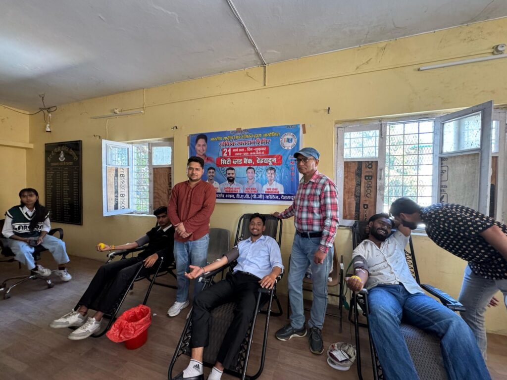 देहरादून- 21 मार्च 2025 : छात्रसंघ अध्यक्ष सिद्धार्थ अग्रवाल के नेतृत्व में एनएसयूआई कार्यकर्ताओं द्वारा डीएवी पीजी कॉलेज में स्वैच्छिक रक्तदान शिविर का आयोजन किया गया, जिसमें कई छात्र-छात्राओं व शिक्षकों ने बढ़-चढ़कर हिस्सा लेते हुए रक्तदान कर महान कार्य किया।