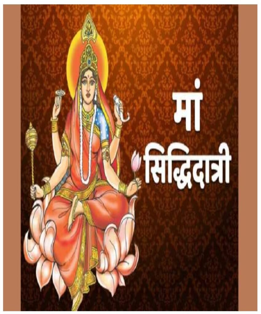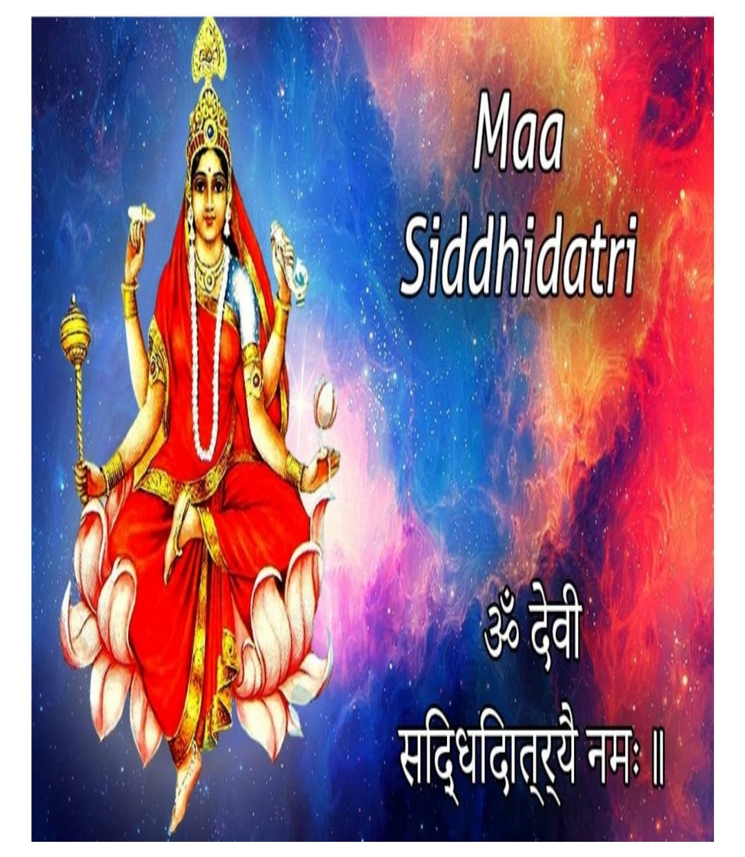 देवी सिद्धिदात्री ध्यान: स्वर्णावर्णा निर्वाणचक्रस्थितां नवम् दुर्गा त्रिनेत्राम्। शख, चक्र, गदा, पदम, धरां सिद्धीदात्री भजेम्॥